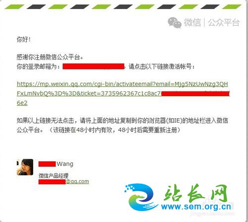 进入你的邮箱以后会收到一封激微信账号的邮件,进入邮件后请点击以下链接激活帐号