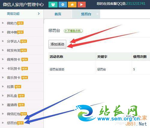 第一步,创建一个趣味性强的游戏,点击左侧位置的--高级功能,选择--惩罚台,点击--添加活动,填写内容,保存后点击--惩罚选项,设置具体的惩罚措施,做好以后在手机上回复关键词查看。