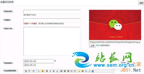 第二步,制作一个现“|金”红包的活动,点击--微信红包--添加活动,填写每个参数,制作好以后也是回复关键词。