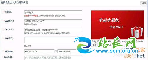 第七步,点击--幸运水果机--新增水果达人活动,创建好以后也是需要回复关键词的,也可以通过自定义菜单或者微官网触发。