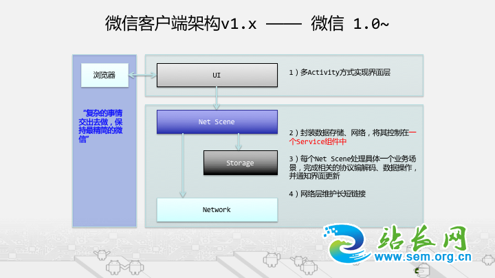 当然,再简单的软件也要考虑基本的设计思路。分层设计思想从这最早的版本开始引入一直到今天。回顾当时的设计,更像是MVP结合事件通知机制。从最上面由Activity组件组成的UI层(VIEW),往下到由NetScene组成的表现层(Presenter),再往下Network负责网络长短连接与数据库的通信与Storage组成的存储层。NetScene是一个网络或者本地任务的基本单元,包括操作网络做数据收发、协议编解码,操作数据库做各种联系人、消息模块的读写。典型的例子如发送一条消息NetSceneSendMsg、做一次收信同步操作NetSceneSync。1.0版本的微信整个UI的activity可能不超过五个。