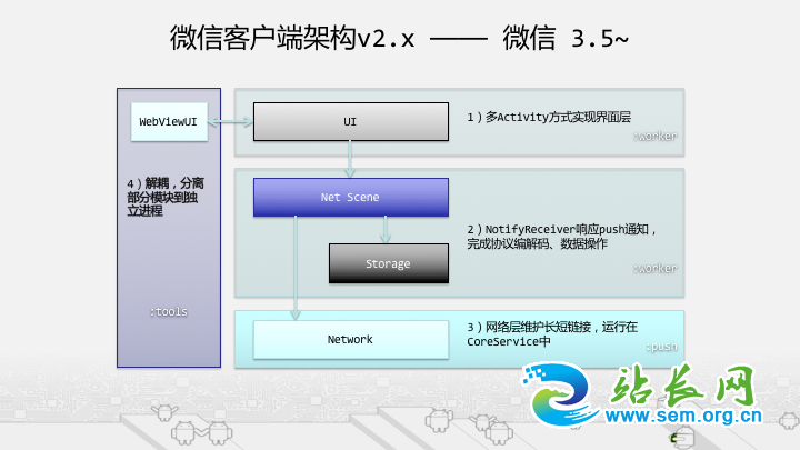 如何解决?方法其实不少,微信选择的,是轻重分离的思路。通过在微信3.5版本时候做的架构重构,实现了不受功能增长、系统缺陷影响的稳定推送方案。