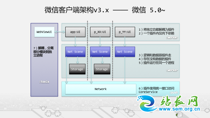 微信在高速发展过程当中,到5.0的时候已经有很多功能,而其中一些功能,随着用户群体、产品设计等因素变化,用户使用的频率在改变。之前试错的一些功能,也大量存留在微信版本中。这些不常使用的功能不应该始终占用程序资源,从架构上进行纵向分离,保证主要场景的体验,是这一时期的主要设计思路。