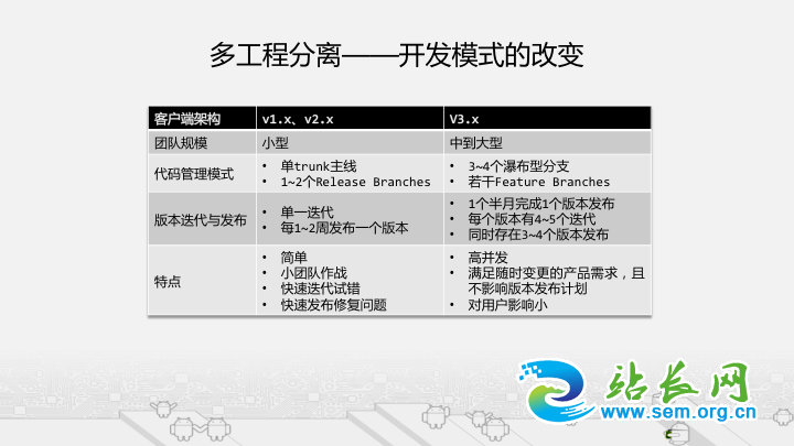 不同的客户端架构时期,背后的团队和开发模式也会有所不同。对比三个版本的客户端架构,v1.x和v2.x的时候比较适合小型团队、没有特别复杂或者反复需求的客户端进行快速开发。单trunk主线开发即可满足。每次发布后,拉出来一个对应的release branch,如果发现有bug或者小优化需要修改,直接在这个release branch上修改、测试、发布上线。这一时期release branch通常保持在两个以内,当前版本和前一版本。当前版本是为了线上问题的快速发布,而前版本则是为了修复一些厂商渠道预装的问题。