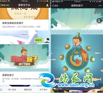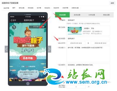 第三步:.点击游戏库,找到游戏位置,里边有最新的游戏,所有游戏制作过程和参与方式都是一样的,教程以屈原吃粽子为例子,鼠标点击游戏图标右边的我要定制按钮,就进到编辑页面了。可以看到左边是预览框,上面是导航菜单,右侧是编辑区域,切换到需要编辑的选项,在预览框里点一下,就可以在右侧修改了。