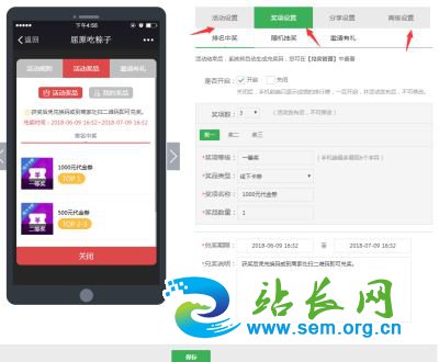 第四步:奖项设置,选择类型,设置数量,注意兑奖时间的设置要在游戏结束以后,然后切换到高级设置,设置虚拟人数、排行榜显示数、版权及上传Logo,关键是最后两项,设置需要关注和设置需要填写手机号,设置完以后点击保存,提示设置成功,然后弹窗是否发布.