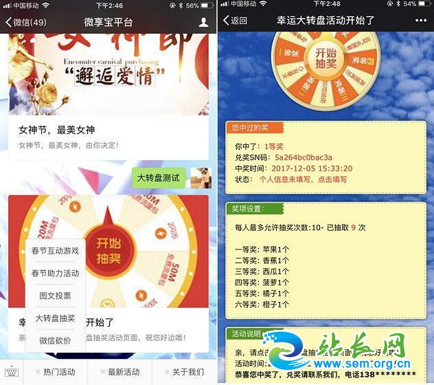 抽奖类活动:微享宝抽奖类营销应用相当丰富,比如摇一摇抽奖,砸金蛋、九宫格、水果机、大转盘、刮刮卡、优惠券。商家可在后台设置好奖品等活动信息与细节设置随机抽奖;分享给好友可获得额外的抽奖机会。简单好玩,粉丝参与积极性大;传播、吸粉;提升粉丝活跃度。