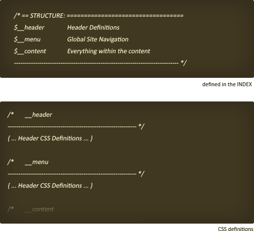 这个定义可以帮助你和其他人更多的理解这个网站。这个索引只是一个格式化的文本段落,和CSS注释一样。 给该CSS的作者以一些著作权声明 定义网站的布局[卷数,固定宽度或全屏] 跟踪版本[对多个编辑者和特别更新很有用]
