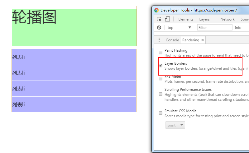 也添加任何能触发生成 Graphics Layer 的属性,但是它也同样也有黄色的边框,生成了一个独立的复合层。