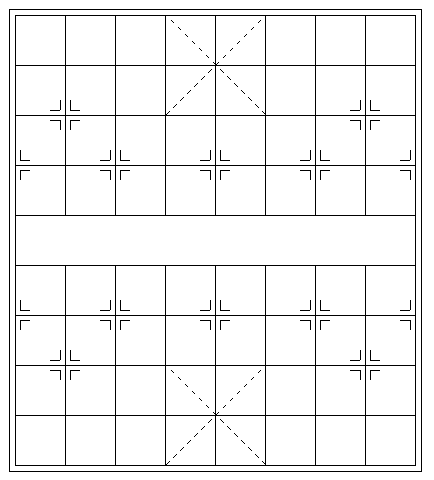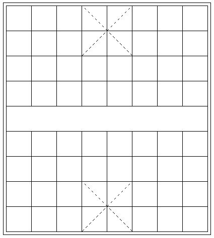 .g-grid { width: 401px; height: 451px; outline: 1px solid #000; outline-offset: 5px; background: // 最上层的白色块,挡住中间的网格 linear-gradient(#fff, #fff), // 实现网格布局 repeating-linear-gradient(#000, #000 1px, transparent 1px, transparent 50px), repeating-linear-gradient(90deg, #000, #000 1px, transparent 1px, transparent 50px), // 棋盘上方的虚线1 repeating-linear-gradient(-45deg, transparent 0, transparent 5px, #fff 5px, #fff 10px), linear-gradient(45deg, transparent, transparent calc(50% - 0.5px), #000 calc(50% - 0.5px), #000 calc(50% + 0.5px), transparent calc(50% + 0.5px), transparent 0), // 棋盘上方的虚线2 repeating-linear-gradient(45deg, transparent 0, transparent 5px, #fff 5px, #fff 10px), linear-gradient(-45deg, transparent, transparent calc(50% - 0.5px), #000 calc(50% - 0.5px), #000 calc(50% + 0.5px), transparent calc(50% + 0.5px), transparent 0), // 棋盘下方的虚线1 repeating-linear-gradient(-45deg, transparent 0, transparent 5px, #fff 5px, #fff 10px), linear-gradient(45deg, transparent, transparent calc(50% - 0.5px), #000 calc(50% - 0.5px), #000 calc(50% + 0.5px), transparent calc(50% + 0.5px), transparent 0), // 棋盘下方的虚线2 repeating-linear-gradient(45deg, transparent 0, transparent 5px, #fff 5px, #fff 10px), linear-gradient(-45deg, transparent, transparent calc(50% - 0.5px), #000 calc(50% - 0.5px), #000 calc(50% + 0.5px), transparent calc(50% + 0.5px), transparent 0); background-repeat: no-repeat; background-size: calc(100% - 2px) 49px, 100% 100%, 100% 100%, // 交叉虚线 1 100px 100px, 100px 100px, 100px 100px, 100px 100px, // 交叉虚线 2 100px 100px, 100px 100px, 100px 100px, 100px 100px; background-position: 1px 201px, 0 0, 0 0, // 交叉虚线 1 151px 0, 151px 0, 151px 0, 151px 0, // 交叉虚线 2 151px 350px, 151px 350px, 151px 350px, 151px 350px; }