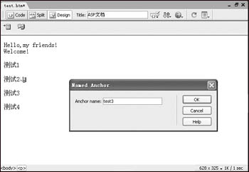 第二步:在“Anchor name”输入框中键入标签名称(比如test3),这时在文本下面会自动出现一个锚式标记来区别开普通的文本内容(如图2)。