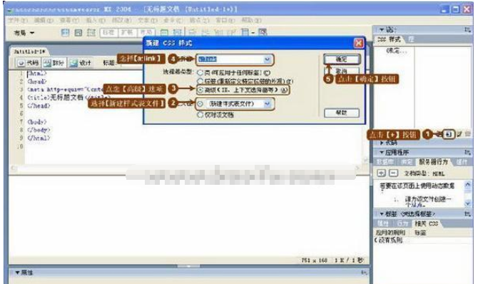 ( 1 )创建一个 CSS 样式表文件。按下 Shift+F11 键打开 CSS 样式面板,单击【新建样式】按钮,在弹出的【新建 CSS 样式】对话框中点选【高级( ID ,上下文选择器等)】选项,然后在选择器下拉菜单中选择【 a:link 】,单击【确定】按钮,如图 22-3 所示。