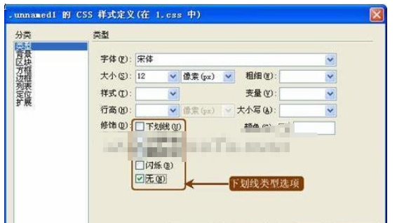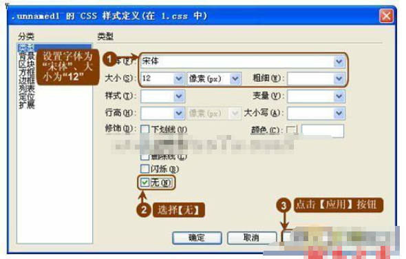 ( 2 )编辑样式。保存样式表文件(文件名为 css.css )后,开始编辑样式。设定默认链接样式为无下划线,字体为宋体 12pt ,其他色彩等参数都不设置,如图 22-4 所示。