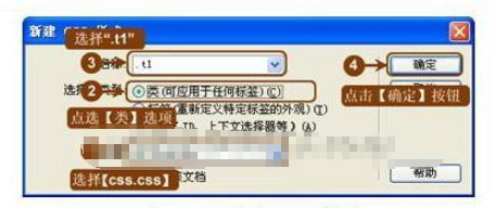 ( 3 )新建并设置样式“ .t1 ”。再次单击【新建样式】按钮,在【新建 CSS 样式】对话框中点选【类(可应用于任何标签)】选项,定义自己的样式类,然后设置名称为“ .t1 ”(【名称】文本框是用来指定类的,用户可以根据需要任意填写,其格式是“ .* ”),最后点选【定义在 css.css 】,一切设置完毕后单击【确定】。接下来的设置跟第二步操作一样,然后单击【确定】,如图 22-5 所示。