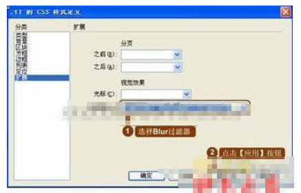 ( 3 )定义特效文字链接。 CSS 样式表中还包含了一组特效滤镜。这里创建一个使用 Blur 滤镜的文字链接,并且该链接还带有边框效果。在【过滤器】下拉菜单中选择【 Blur ( Add=?,Direction=?,Strength=? )】选项,然后更改滤镜参数设置为“ Blur ( Add=ture,Direction=45,Strength=1 )”,如图 22-10 所示。