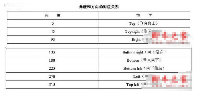 Add 参数有两个参数值,即 True 和 False ,其作用是设定是否为图片添加模糊效果。 Direction 参数用来设置模糊的方向。模糊操作是按照顺时针方向进行的,其中 0 °代表垂直向上,每 45 °一个单位,默认值是向左 270 °。角度和方向的对应关系见表 22-1