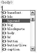 用Dreamweaver打开需要添加背景音乐的页面,点击“代码”打开代码编辑视图,在<body></body>之间输入“<”在弹出的代码提示框中选择bgsound(图1)。