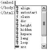 它的使用方法与第一种基本一样,只是第一步的代码提示框里不要选择gbsound,改而选择embed即可。然后再选择它的属性进行相应的设置(图3),从图中可看出embed的属性比gbsound的五个属性多许多。最后的代码如下:<embed src="music.mp3" autostart="true" loop="true" hidden="true"></embed>。