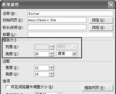 以FrontPage 2003为例,执行“新建→其他网页模板”弹出“网页模板”窗口,选择“框架网页→页脚”,“确定”后在上框架里设置初始网页指向你的主页,下框架里则指向music.htm,然后在框架属性中去掉框架边框并适当调整下框架的高度(图4),框架高度足以容纳播放条的高度即可。预览满意后就可以保存页面了,然后把你的网站指向这个新页面就可以了。