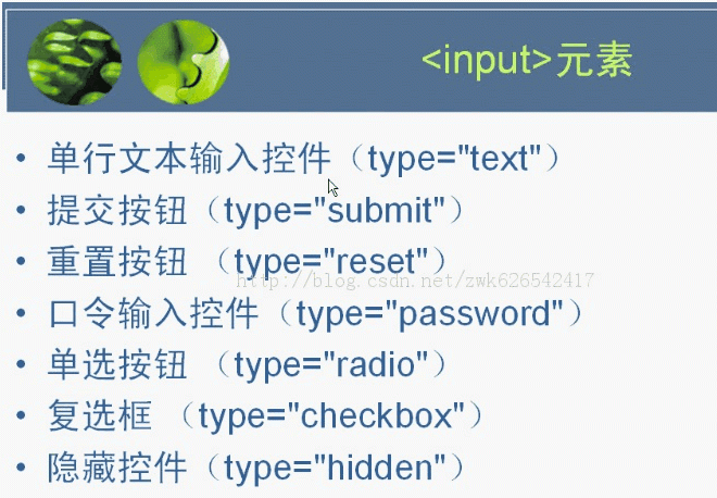 属性type用来指定要创建的控件的类型,属性那么用来指定控件的名称,size用来指定表单中控件的初始宽度,属性value指定控件的初始值。