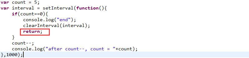 我们惊奇的发现,并不是我们想象中的那样,setInterval这个函数,并不会在清理定时器之后,就退出,后续的操作还是会执行。为了让清除定时器之后的代码不再执行,我们可以直接进行return返回。