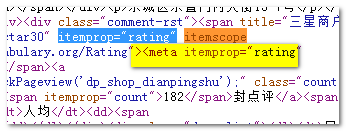 上面截图各种标注的部分就是本文多次出现了微数据特有的关键属性,名称等。也就是说,点评的搜索结果的显示之所以不同,是因为其应用了HTML5之微数据,使用的词汇表是相对简单的Google丰富网页摘要词汇表中的。
