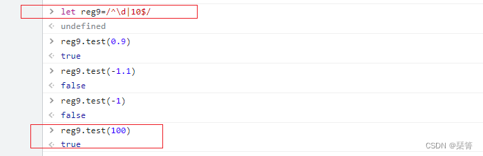 2.有多个选项可以选择时,选项之间用 | 分开,所有选项要用 ()括起来这些选项,否则也是有问题的。 /^\d|10$/ 无法实现匹配 0-10的正整数;/^(\d|10)$/可以正确匹配0-10的正整数