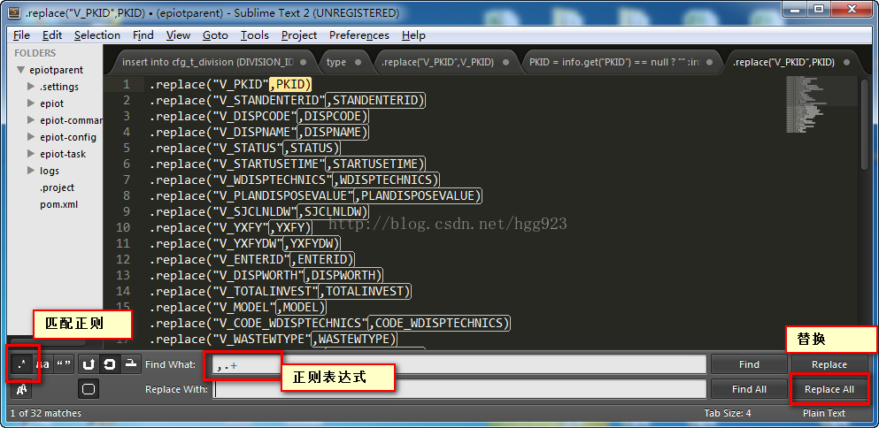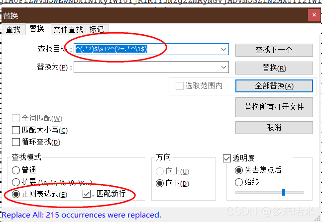 步骤二:在ctrl+h界面alt+r 搜索\n替换换行(replace all替换所有)